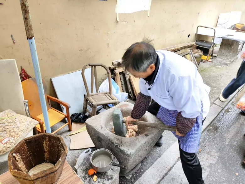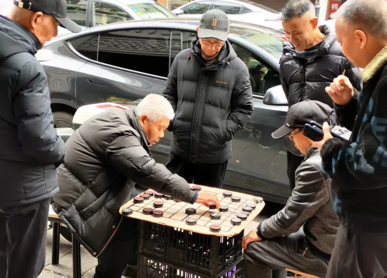 公园里热闹非凡,羽毛球在空中飞舞,两位搭档正激烈“对战”。街边,棋友们在楚河汉界上排兵布阵;不远处的摊位前热气腾腾,师傅正挥杵捣年糕,围观市民踮脚张望。刚出臼的软糯年糕蘸上红糖,咬下一口,寓意着“年年高升”的好彩头。