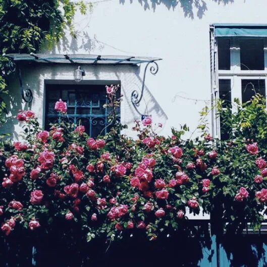 被藤蔓爬满墙的建筑,盛开在墙上的花朵,风带来淡淡的花香。
