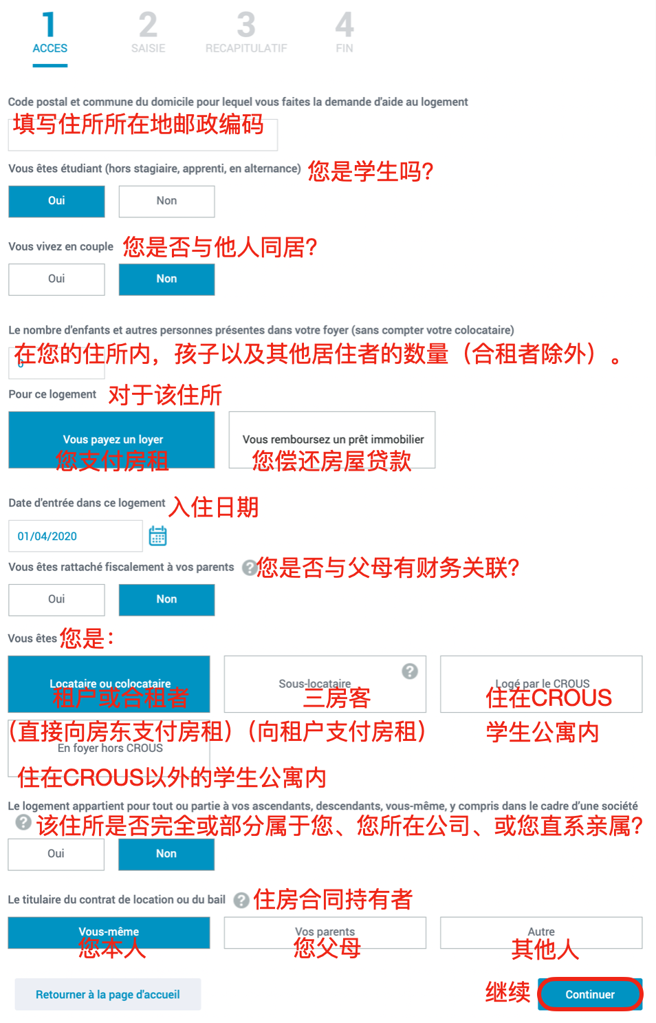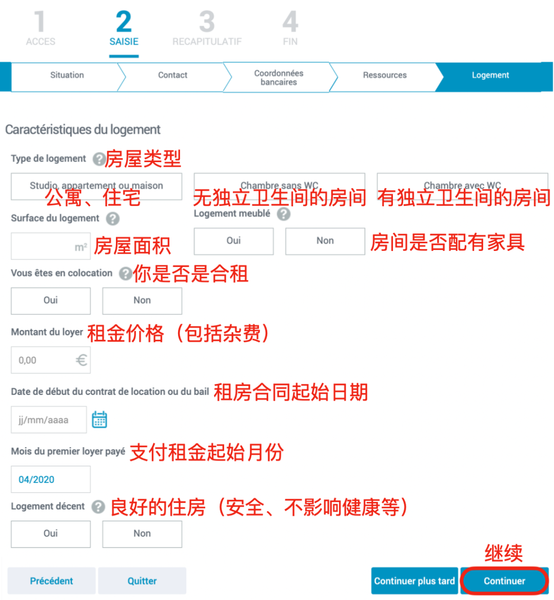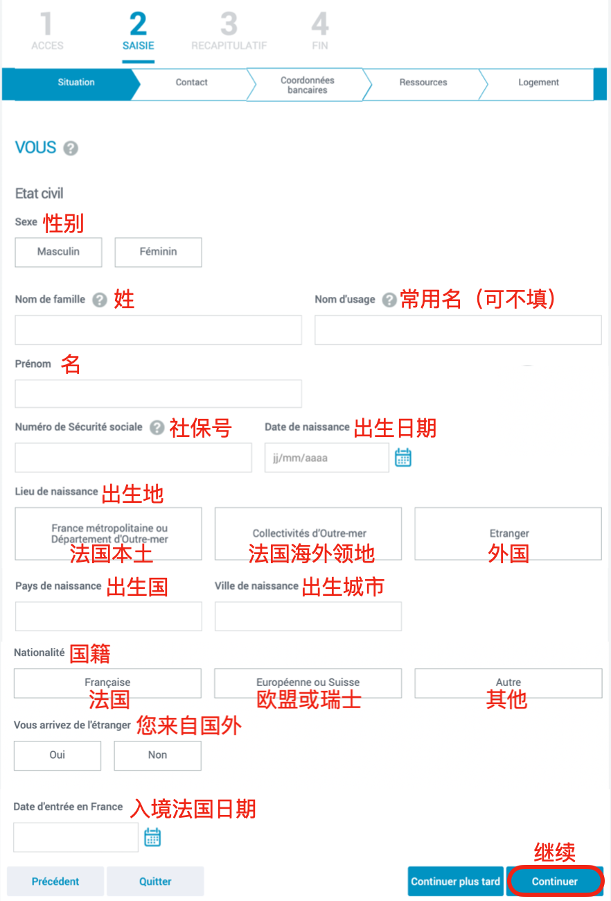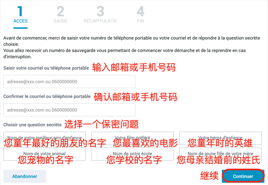 - 填写以下基本信息,每次填写完信息后,界面内会自动弹出后续问题,填写完毕后点击“Continuer”(继续)进入下一界面。