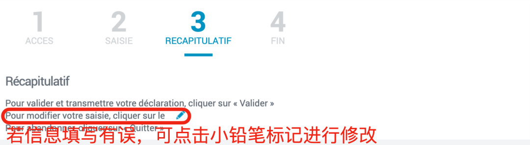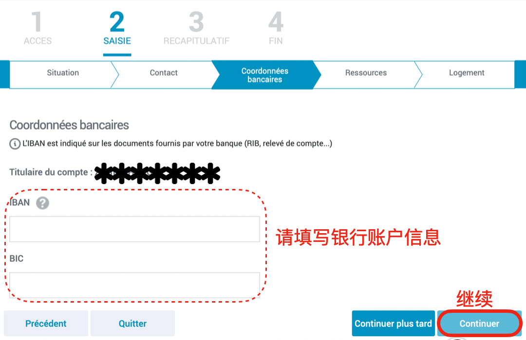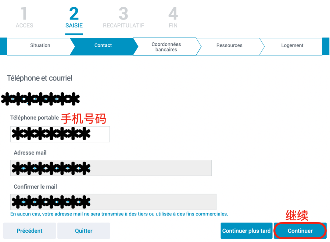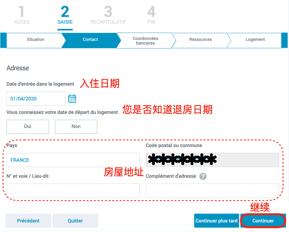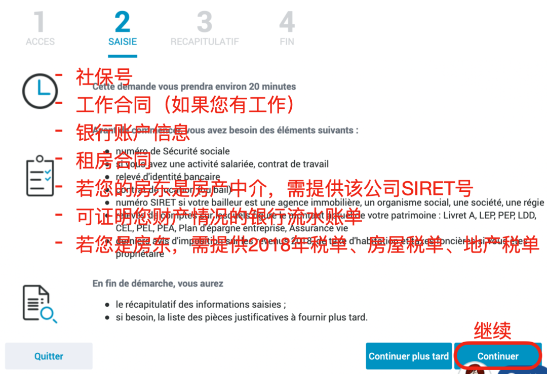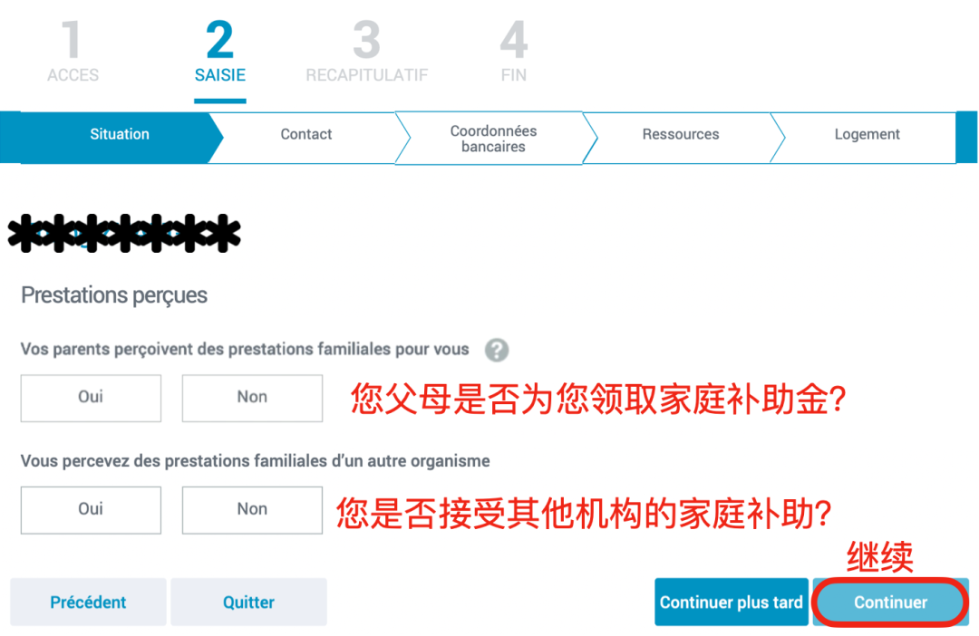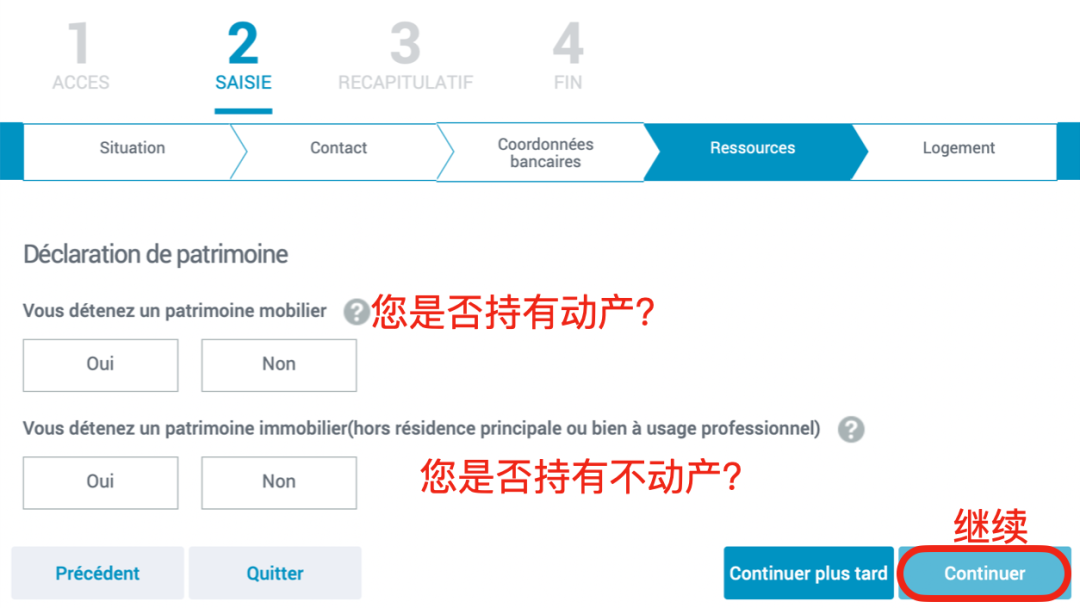- 填写以下基本信息,每次填写完信息后,界面内会自动弹出后续问题,填写完毕后点击“Continuer”(继续)进入下一界面。