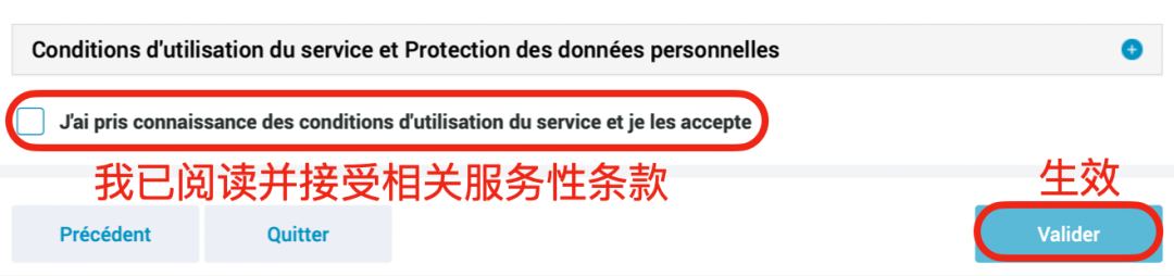确认无误之后,勾选“我已阅读并接受相关服务性条款”后,点击“Valider”(生效)。