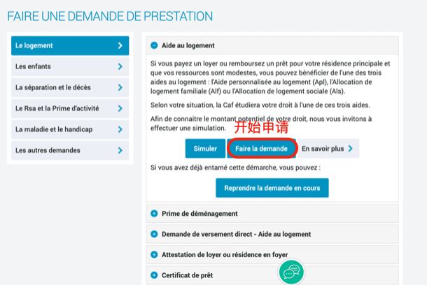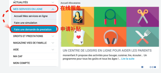 1. 进入CAF官网:http://www.caf.fr;点击“SERVIR EN LIGNE”(在线服务)后;点击“Faire une demande de prestation”(申请补贴)。