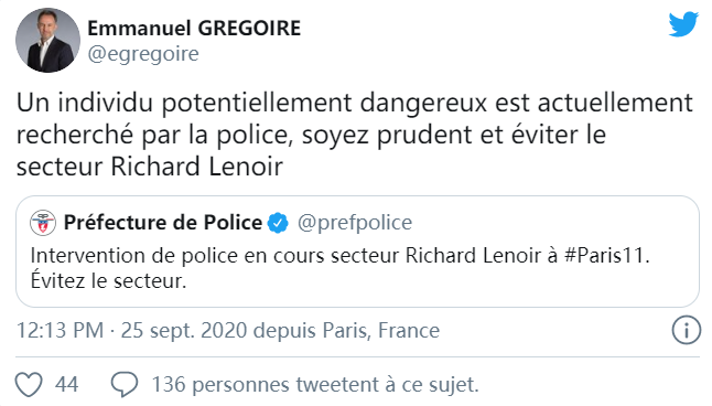 到中午12点半左右,有人在巴士底地区发现了一名身穿血衣的男子,警方立刻实施了抓捕行动,并认为此人有重大作案嫌疑。2小时后,另一个衣服带血的嫌疑人也在Richard-Lenoir大街被捕。