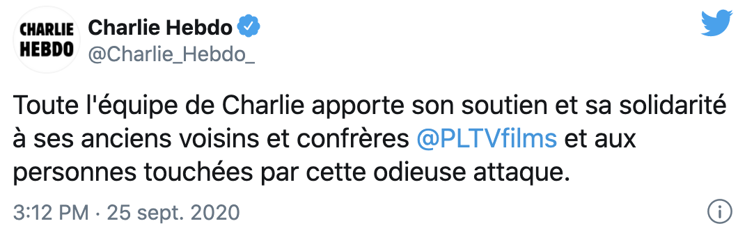 《查理周刊》得知此事后,也在自己的推特上表达了受害者的慰问,并谴责了袭击者的无耻行为。