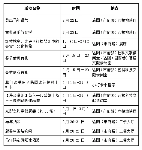 据温州市图书馆通知,春节期间(2月15日至2月23日),图书馆开馆时间调整为8:30-17:00。节日期间,温图结合自身馆藏优势和服务特色,策划了一系列丰富多彩的文化活动:市图书馆内设有马年拓印、钩织中国结、剪纸马年冰箱贴等线下新年文化活动;少儿图书馆也推出在线答题、闯词闯关等线上文化活动,全方位满足读者春节假期的文化需求,让大家在书香中度过一个有意义的新春佳节。