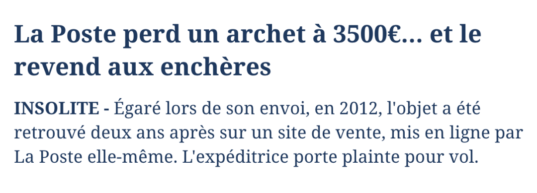 的确,小编查一下相关的报道和法律,似乎法国邮政宣称的「6个月后自动获得所有权」只是他们内部相关的规定,并没有什么法律依据。在2012年时还有这样的一个案子:当时,巴黎一个音乐家订购了一副价值3500欧的小提琴琴弓,结果几天后,邮局告诉他包裹丢了。没想到在一段时间后,他竟然在法国的二手网站看到了自己订做的琴弓。