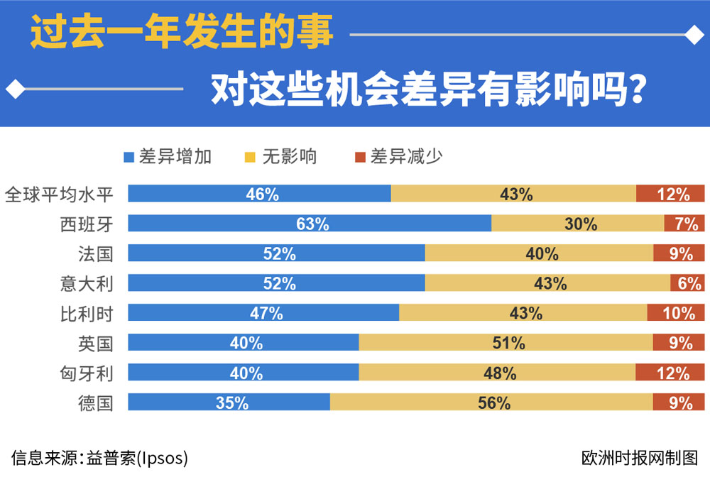 根据调查结果,有52%的受访法国人认为,2020年暴发的新冠疫情危机成为歧视现象恶化的主要因素,这些歧视现象主要表现在住房、就业、教育,甚至还有社会服务等方面。然而,在全球范围内,这一比例仅占受访者的46%。相反,有43%的受访者认为疫情危机并未带来什么影响。