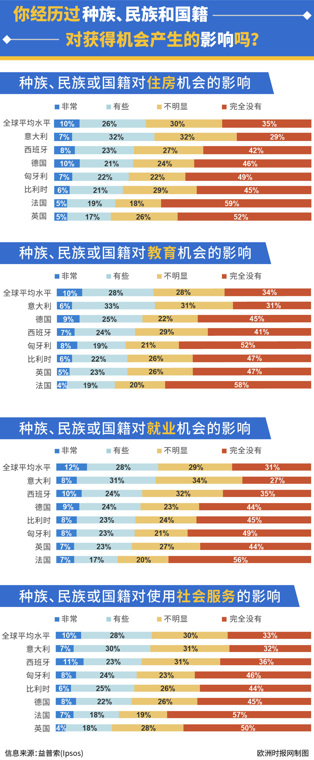 包括法国人在内的欧洲多国民众承认经历过种族、民族和国籍对住房、就业、教育等方面的影响。(图片来源:欧洲时报网制图)