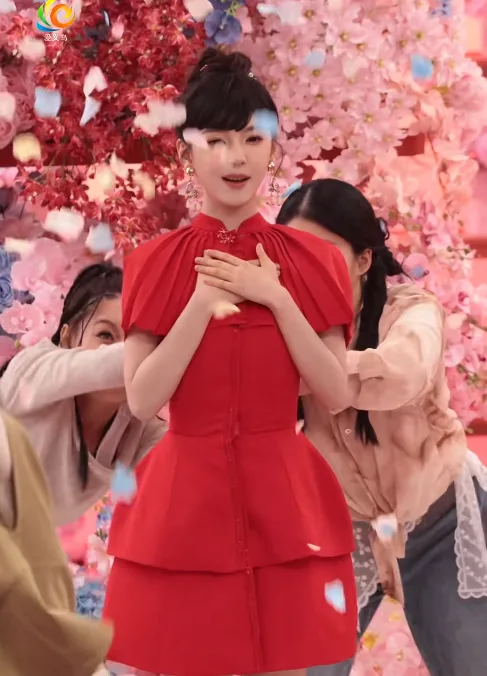 舞台上,章若楠先是以一袭红色礼服登场献唱。随着粉色花瓣簌簌落下,她“一秒变装”,身着银色短裙优雅亮相。