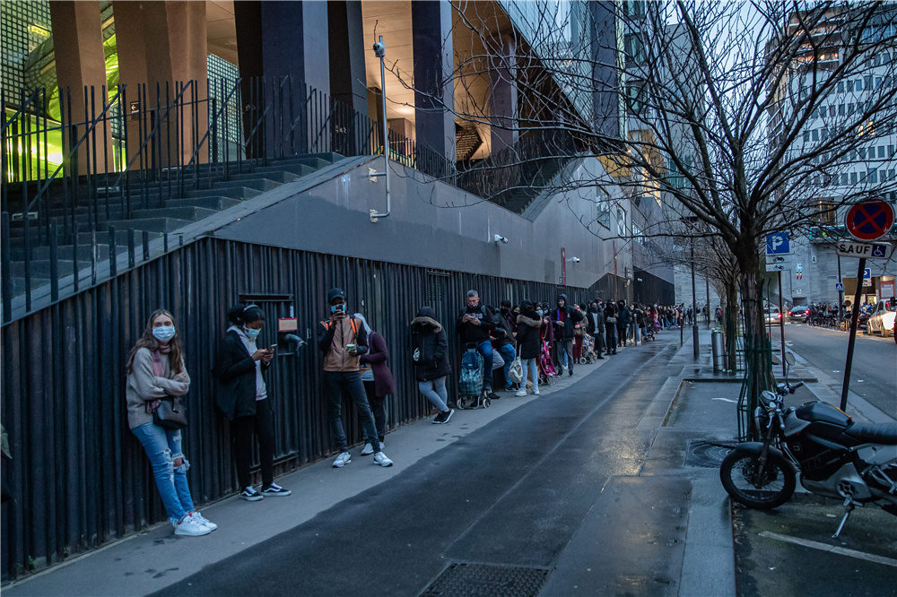 2月22日,在法国巴黎,学生排队等待领取免费食品。(图片来源:新华社)