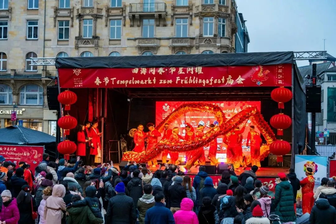 当碇步龙舞龙队登场,铿锵鼓乐骤然响起,队员们身着盛装、默契配合,模仿碇步之上的腾跃翻转,龙身时而盘旋起伏,时而蜿蜒游走,灵动的姿态仿佛将浙南山水的灵秀带到了莱茵河畔。德国友人们纷纷驻足围观,不少人拿出手机、相机拍摄,满是好奇与赞叹。