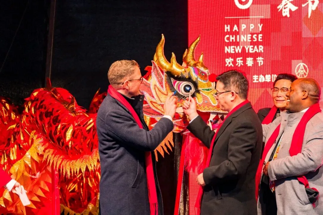 庙会现场,广场上红灯笼高悬,洋溢着浓浓的中国年味儿。与会嘉宾共同为庙会剪彩,中国驻法兰克福总领事黄昳扬,德国黑森州科研、艺术和文化部国务秘书迪根(Christoph Degen),埃塞俄比亚驻德国大使阿斯福(Eskindir Yirga Asfaw)等嘉宾,携手德国文成华侨华人联谊会会长赵东荣,为泰顺碇步龙点睛,“唤醒”祥龙。