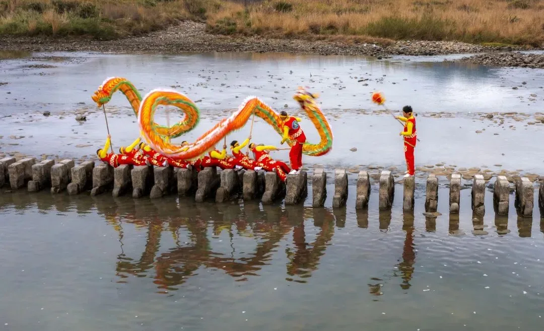 作为流传于泰顺仕阳镇的独特民俗,碇步龙有着两百余年的悠久历史,于2011年被正式列为国家级非物质文化遗产代表性项目,被誉为“浙南山区文化的活化石”。仕水碇步作为国家级文物保护单位,全长144米、共233齿,舞龙者在狭窄的碇步上腾跃翻飞,龙影倒映水面,构成一幅灵动的民俗画卷,其表演融合武术、舞蹈与民俗风情,独具东方韵味。