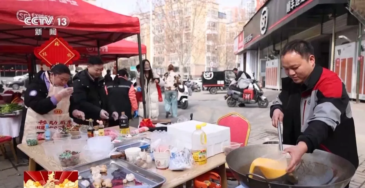 为了让值班的快递员能吃上热乎饭,快递站点在门口支起一口大锅,员工和来帮忙的家属给大家准备丰盛的“爱心餐”。