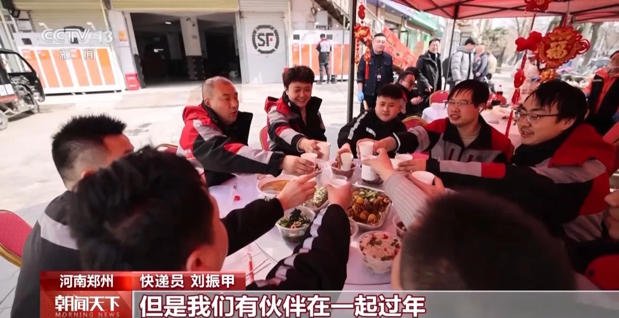 快递员 刘振甲:今年我是第二年值班了,虽然说我们没办法回家,没法跟家人团聚,但是我们有伙伴在一起过年,很开心,有一个团聚的氛围。
