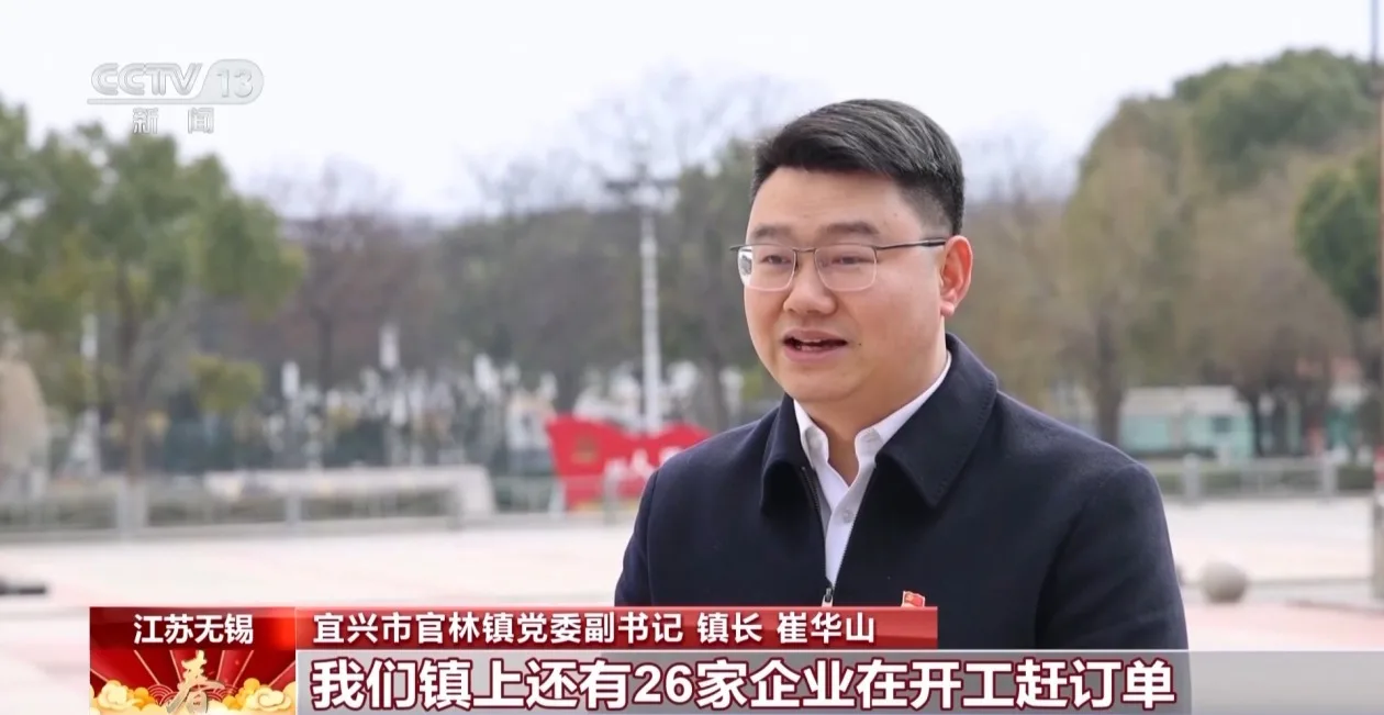 江苏省宜兴市官林镇党委副书记 镇长 崔华山:春节期间,我们镇上还有26家企业在开工赶订单,通过这种形式给企业鼓鼓劲、加加油,也让外地员工感受家的温暖、年的味道。