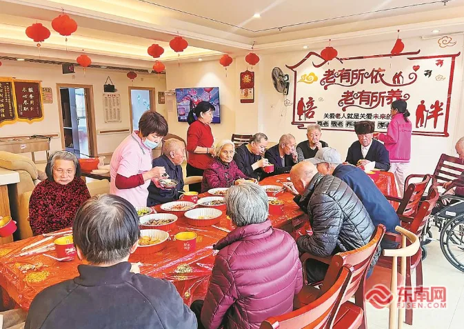2月16日,位于泉州市洛江区的金秋家园颐养中心,老人们在家属和工作人员的陪同下共享年夜饭。福建日报记者 汤海波 通讯员 郭晓玲 摄