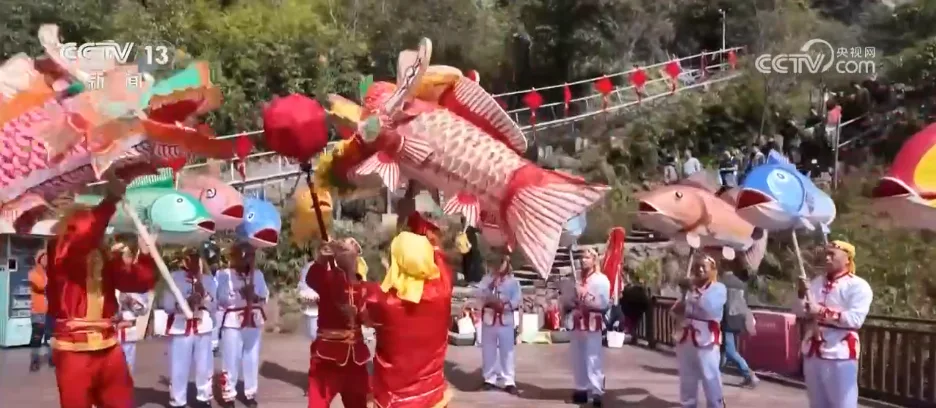 记者身后的九鲤湖景区,湖光山色、层峦叠翠,展现出南方山岳特有的灵秀。景区里最热门的打卡点之一,叫做“一线天”。这里最窄处不到30厘米,一次只能容一人贴壁通过,游客需要侧身慢慢穿行,在狭窄石缝间体验攀登的乐趣。记者身旁正在巡游的就是当地的非遗——店下鱼灯。大家看,一盏盏彩绘鱼灯随着队伍前进上下摆动,像鱼儿在水里游,特别灵动。在过去,渔民会用鱼灯祈愿出海平安、丰衣足食。过年的时候看鱼灯,也寓意“年年有余、风调雨顺”。