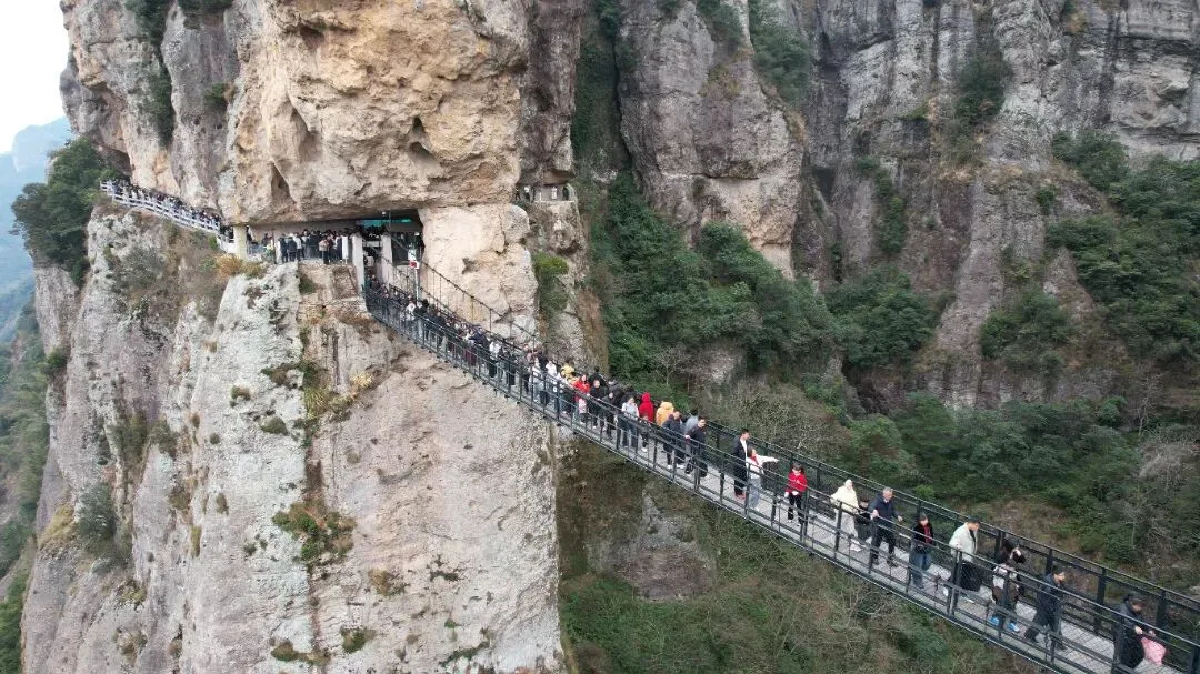 山水寻趣,在奇峰秀水间解锁潮玩新体验。雁荡山化身潮流游乐场,除经典的“五福迎春”寻福活动外,游客可在方洞至灵岩一线的悬崖咖啡馆手捧热饮,凭栏览胜。