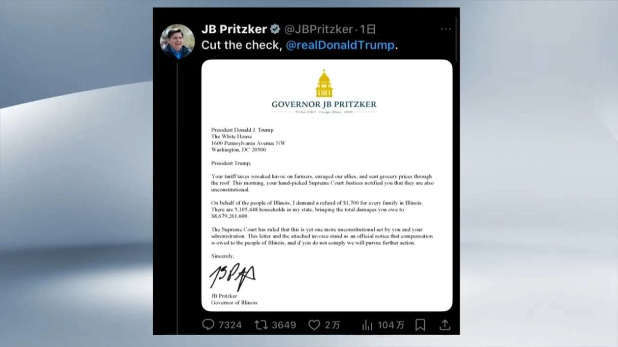您的位置 > 首页 > 国际 美伊利诺伊州长致函白宫:请退87亿美元税款 来源: 央视新闻客户端 | 2026-02-22 | 👁:9 美国伊利诺伊州州长、民主党人普里茨克21日致函美国总统特朗普,要求为该州每个家庭退还1700美元关税,退税总额约87亿美元,约合人民币601亿元。普里茨克在社交媒体发布了相关的账单,并配文“请付款”。 标签: 暂无标签 上一篇 美媒:网飞董事会成员警告“向特朗普屈膝”企业将自食其果,特朗普怒了 ❤️ 赞一个 (0) 🔗 分享 用户评论 (0) 暂无评论,快来抢沙发吧!首评可提升互动曝光。 请 登录 后参与互动