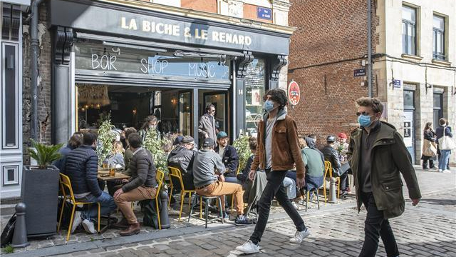 5月19日,人们在法国里尔餐吧室外部分小聚。(图片来源:新华社)