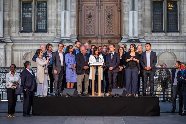 2020年6月28日,巴黎现任市长、社会党候选人安妮·伊达尔戈(前中)在法国巴黎市政厅前出席选举后的庆祝集会。(图片来源:新华社)