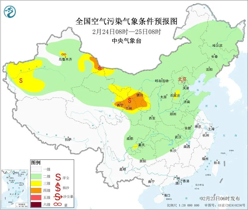 由于沙尘天气范围缩小、强度减弱,因此解除沙尘暴蓝色预警。但2月23日08时至24日08时,青海东北部、宁夏中北部、陕西中北部、河南、湖北北部、浙江中部等地的部分地区仍有扬沙或浮尘天气。