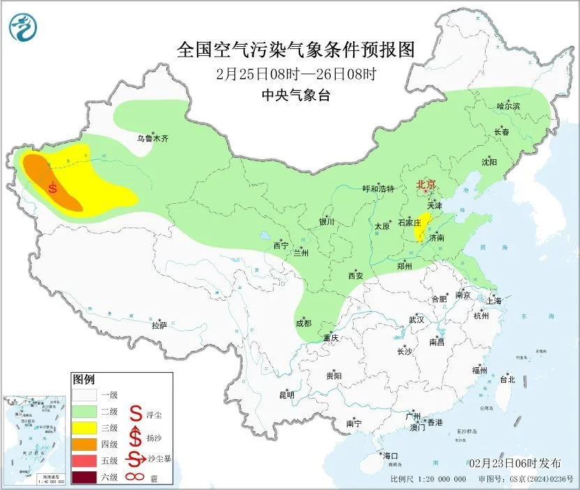 23日,受上游传输影响,区域大部有扬沙或浮尘天气。24日起,区域大气扩散条件一般,其中陕西关中地区有轻度霾。