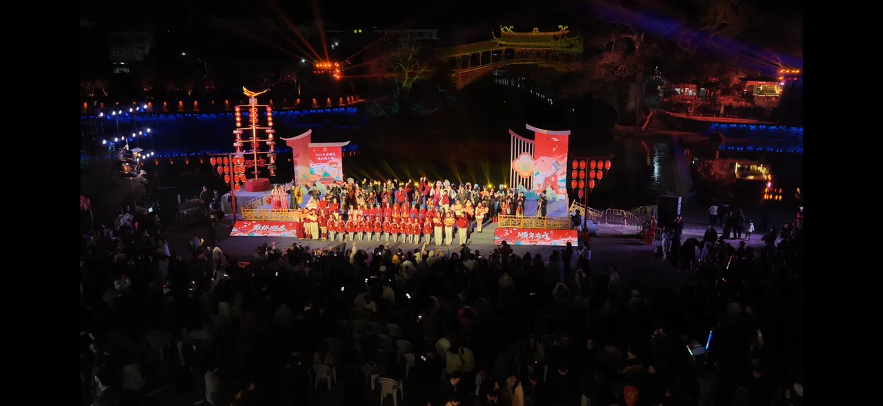 烟熏腊兔、土豆饼、九层糕、苦槠片、土鸡煲……满满一桌菜,都是来廊桥必吃的“泰顺十大碗”美食,就在客人们大快朵颐时,廊桥音乐会在一曲“我在廊桥等你”中拉开帷幕。此时,灯光汇聚在北涧桥身,以《廊桥相见》为主题的灯光秀同步上演,亲子团欢呼声一片。