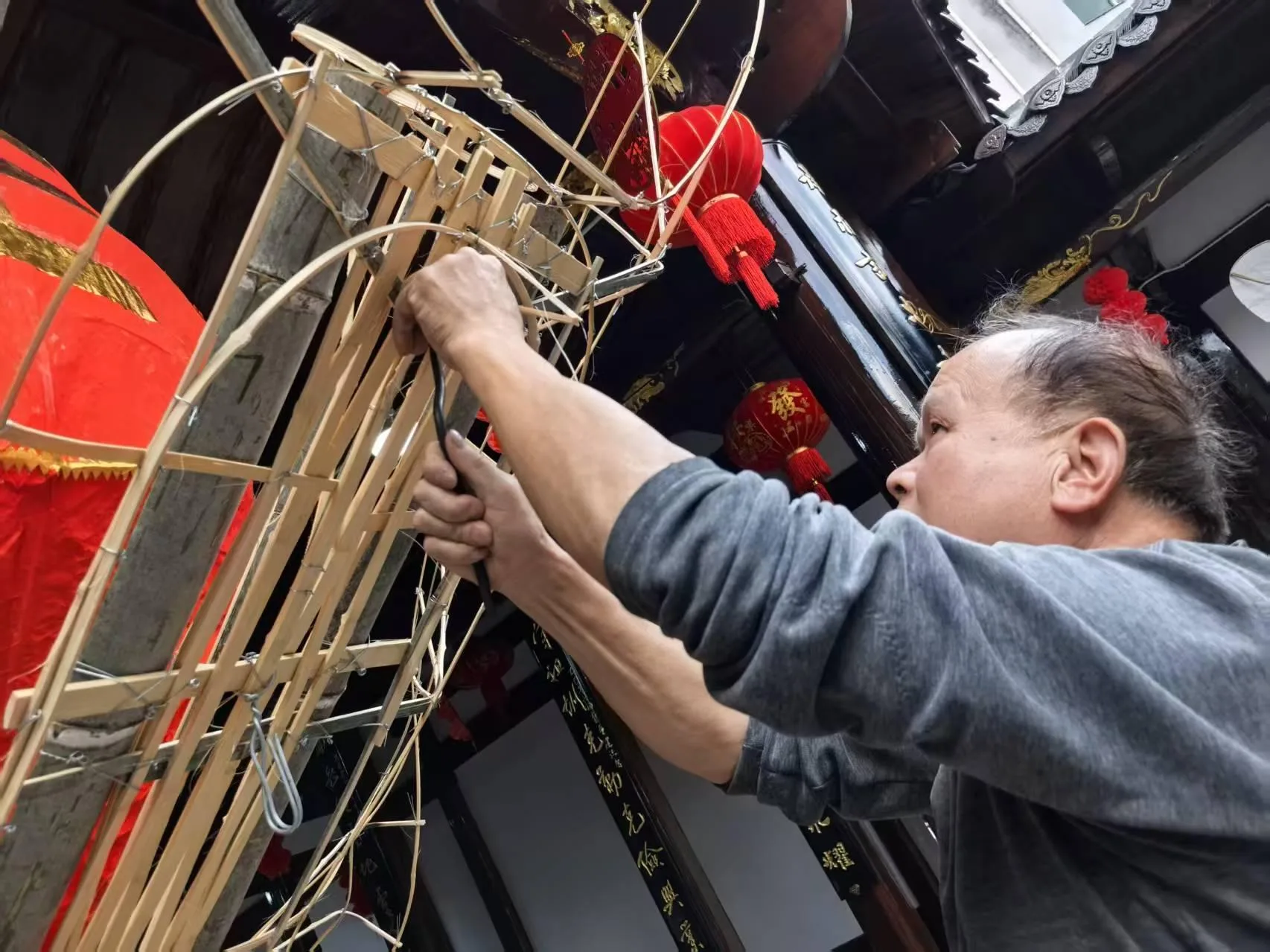 东南网2月23日讯(记者 吴静 文/图)新春年味正浓,元宵盛会将至。2月22日下午,连城县姑田镇中堡村朝相公祠内一派热火朝天的忙碌景象,非遗传承人华师傅正专注地削竹篾、扎骨架、组装龙头框架,紧锣密鼓赶制被誉为“天下第一龙”的姑田大龙,为元宵游大龙民俗活动做足准备。