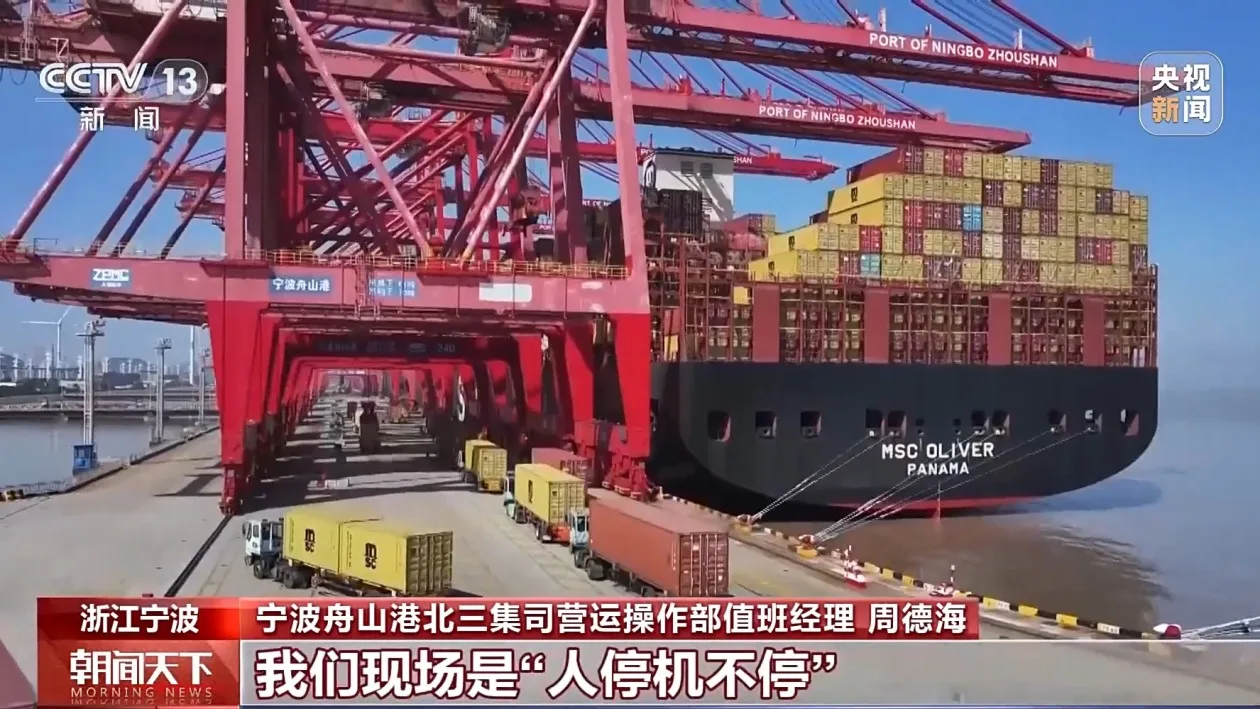 陆路班列接续开行,海上和空中的贸易链接同样密切。宁波舟山港在春节期间装卸作业24小时不间断。大年初一到初六,宁波舟山港完成集装箱吞吐量超78万标准箱,同比增长超17%。