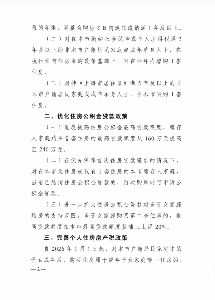 一是缩短非沪籍居民购买外环内住房所需缴纳社保或个税年限。 对非本市户籍居民家庭或成年单身人士购买外环内住房的,购房所需缴纳社会保险或个人所得税的年限,调整为购房之日前连续缴纳满1年及以上。