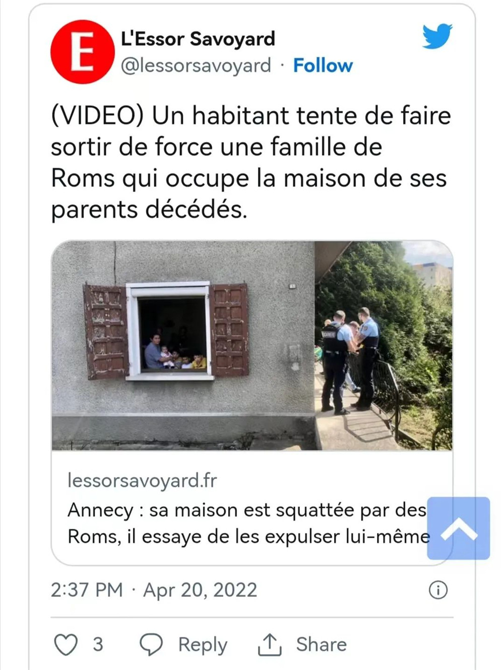 在Haute-Savoie的Trémolat市,第一副市长Eric Chassagne继承了父母在Annecy的一栋房子,2年内3次被侵占。头两次,警察把占房者驱逐了,但第三次就无能为力了,因为占房者带着“一堆小孩”。