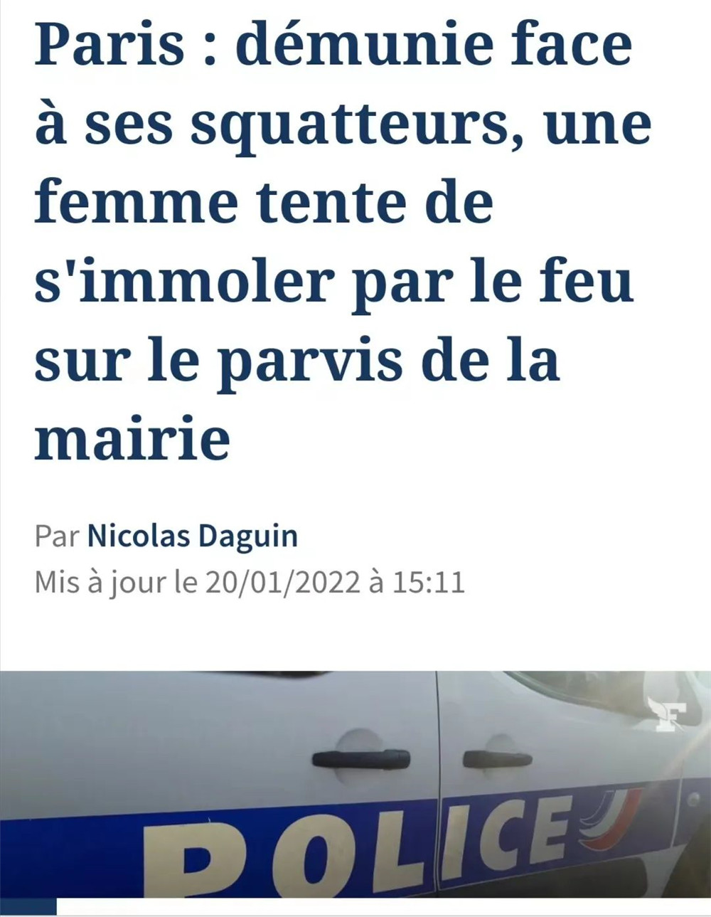 今年1月,巴黎一名59岁的学校清洁女工Jeanine,房子被“假租客”侵占10多年,走投无路,准备在市政府大楼广场上自焚,以死换取市长伊达尔戈的关注,幸好最后被救下。