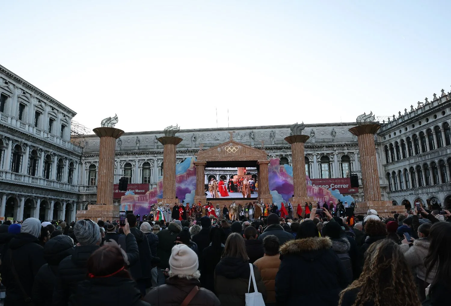 2月1日,在意大利威尼斯,人们在圣马可广场观看演出。狂欢节主舞台采用奥运主题造型。(图片来源:本文图片均据新华社)