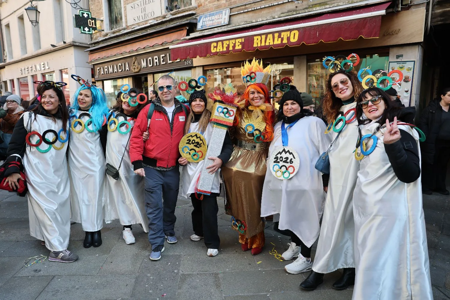 2月1日,采用奥运主题装扮的狂欢节参与者在意大利威尼斯合影。