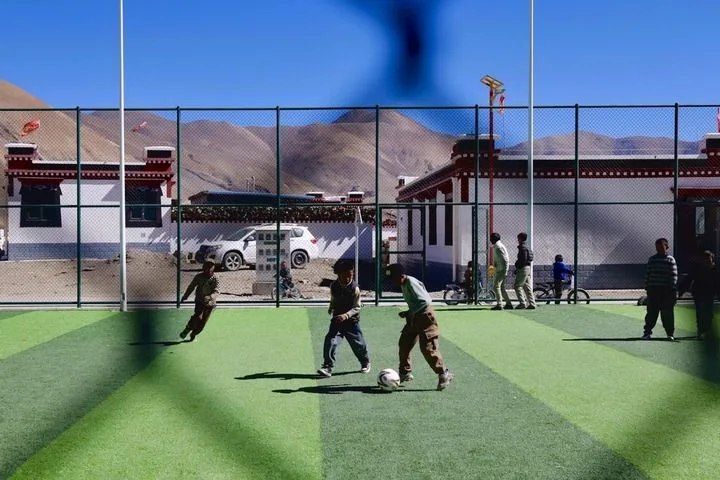 场地上,初中生达瓦罗布正在和伙伴们踢球,他们五人一队,传球、突破、射门。场边围坐着家人和朋友,不时给予热烈的掌声和叫好声。“以前只能在尘土中踢球,坑坑洼洼的,一摔就是一身土。”达瓦罗布喘着气跑过来,脸上还挂着汗,“现在球场干净又平整,踢着特别舒服。”