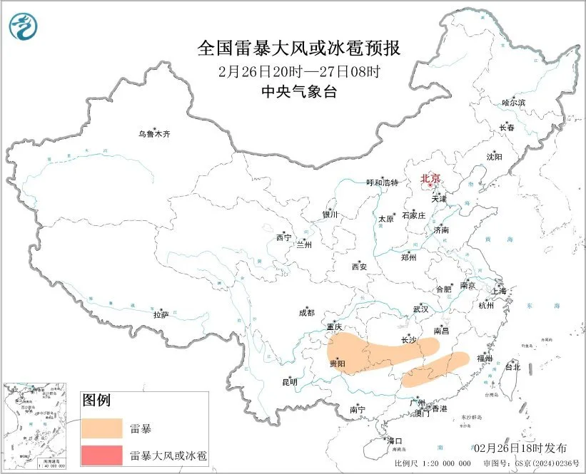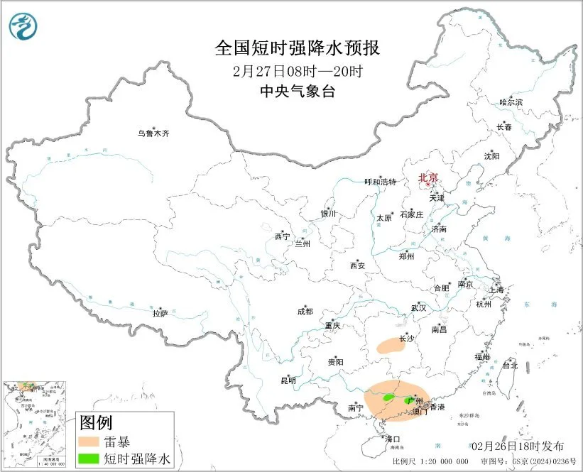 预计2月26日20时至27日20时,湖南西南部、江西南部、福建西部、贵州东南部、广西东部、广东中部等地的部分地区将有短时强降水天气,小时雨量20-30毫米,局地可达30毫米以上;另外,湖南中南部、江西中南部、福建西南部、贵州中东部、广西东部、广东中西部等地的局地将有雷暴。