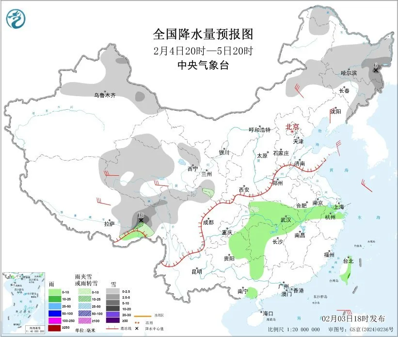 图2 全国降水量预报图(2月3日20时-4日20时)