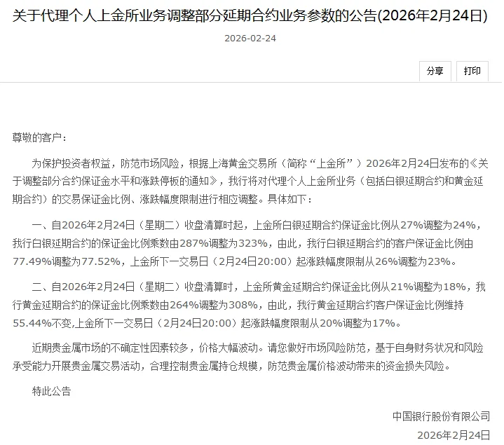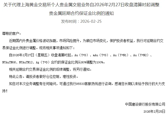 2月25日,农业银行发布《关于代理上海黄金交易所个人贵金属交易业务调整延期合约保证金比例的通知》。通知称,近期国际贵金属市场价格波动加剧,个人客户交易类贵金属业务市场风险上升。为切实保护投资者利益,自2026年2月26日收盘清算时起,Au(T+D)、mAu(T+D)、Ag(T+D)合约的保证金比例从80%调整为100%。