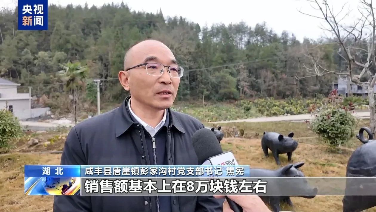 咸丰县唐崖镇彭家沟村党支部书记 焦宪:我们的粉丝已经达到了7万多人,现在每天一场直播,销售额基本上在8万块钱左右。每天可以给老百姓销售黑猪接近十头,还有我们老百姓的土鸡、土鸭以及时令蔬菜。