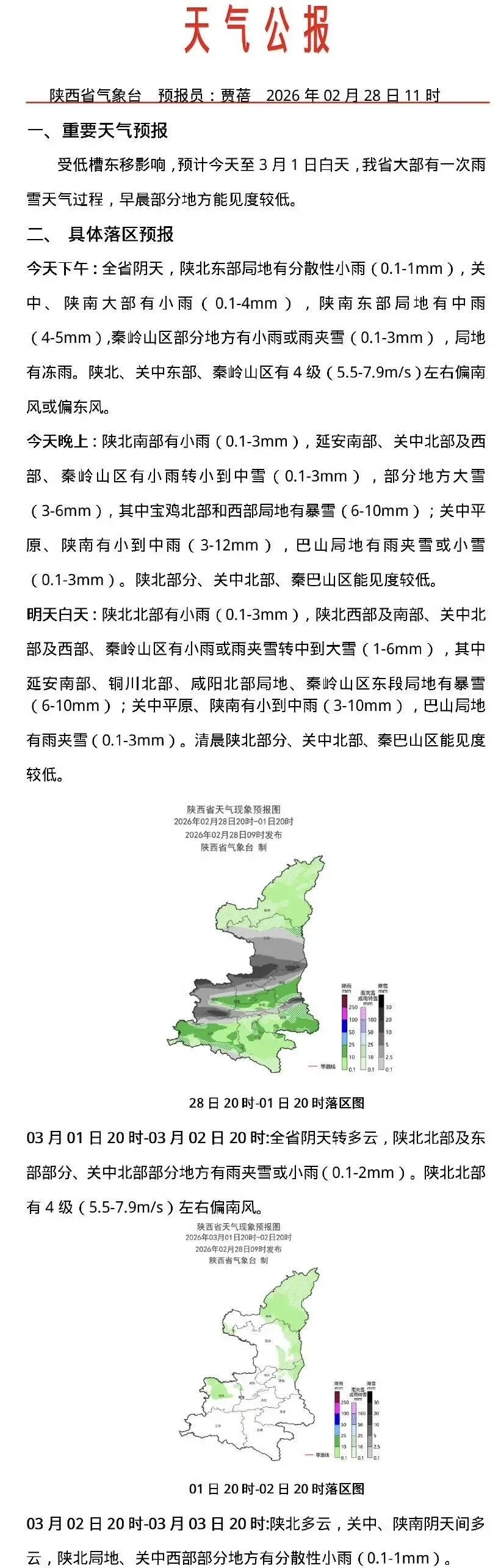 周至县气象台:受低槽东移影响,28日至3月1日自西向东有一轮雨雪、降温天气,预计平原地区以小到中雨为主,高海拔山区中到大雪、局地暴雪;过程期间降水相态复杂,预计平原地区28日夜间有雨夹雪,3月1日凌晨可能出现短时段湿雪,高海拔山区28日白天部分时段可能有冻雨,夜间转为纯雪;过程期间最高气温下降8℃~10℃,易出现低能见度天气。为确保人民群众生命财产安全,经县防灾减灾救灾指挥部会商研判,决定自2月28日12时起至本轮降雪结束对我县秦岭山区所有峪口实施封闭管理,现就有关事项通告如下: