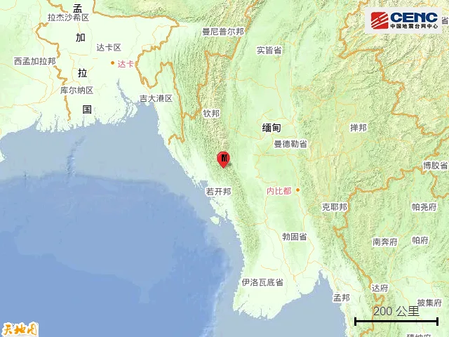 周边城市:震中200公里范围内有3座大中城市,最近为木各具(Pakokku),距震中约157公里。
