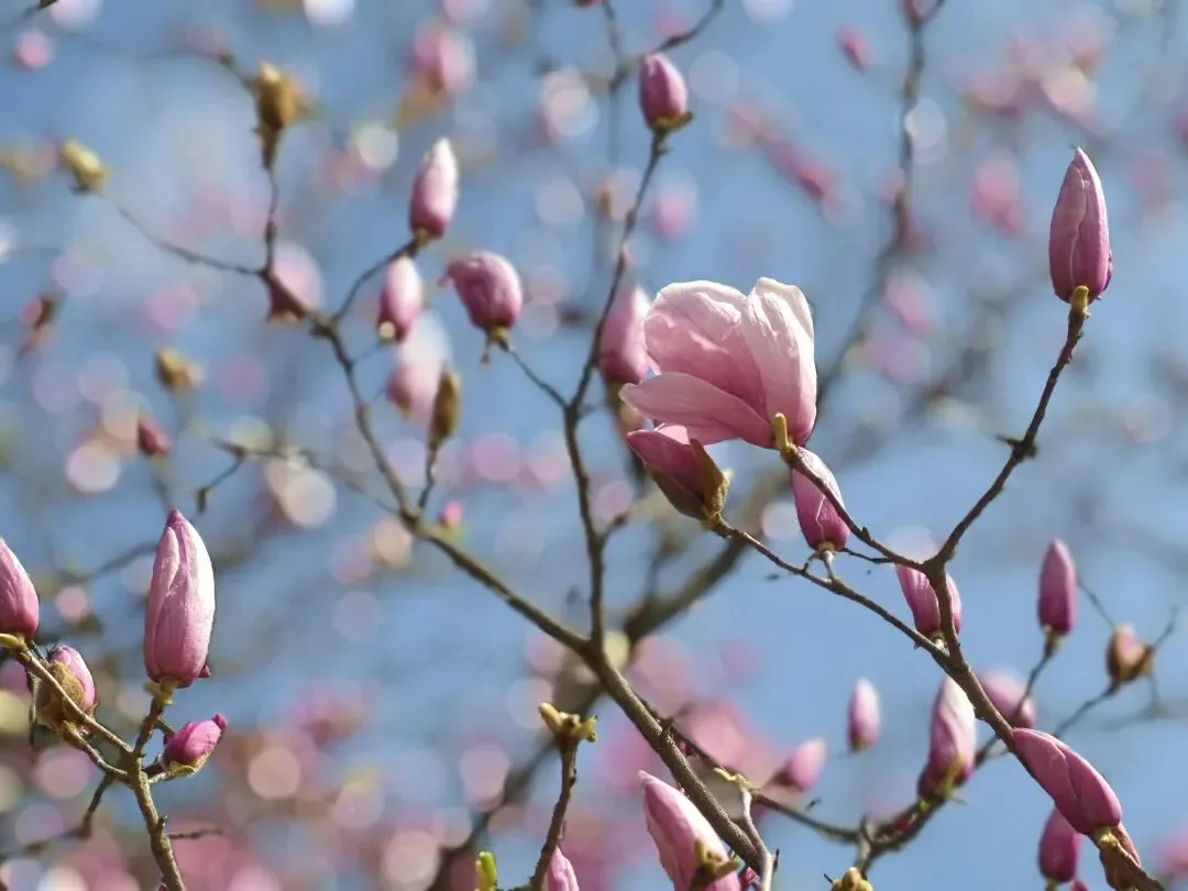 粉玉兰次第舒展,浅粉盈枝、瓣润如霞,清风拂过暗香浮动,漫步其间尽是春日温柔浪漫。