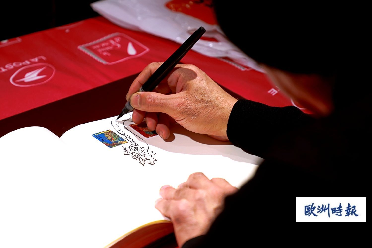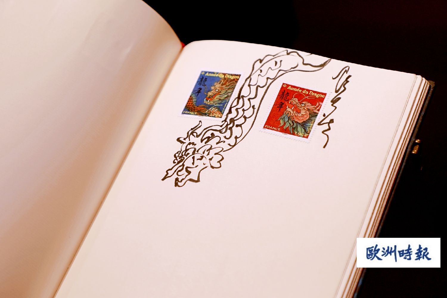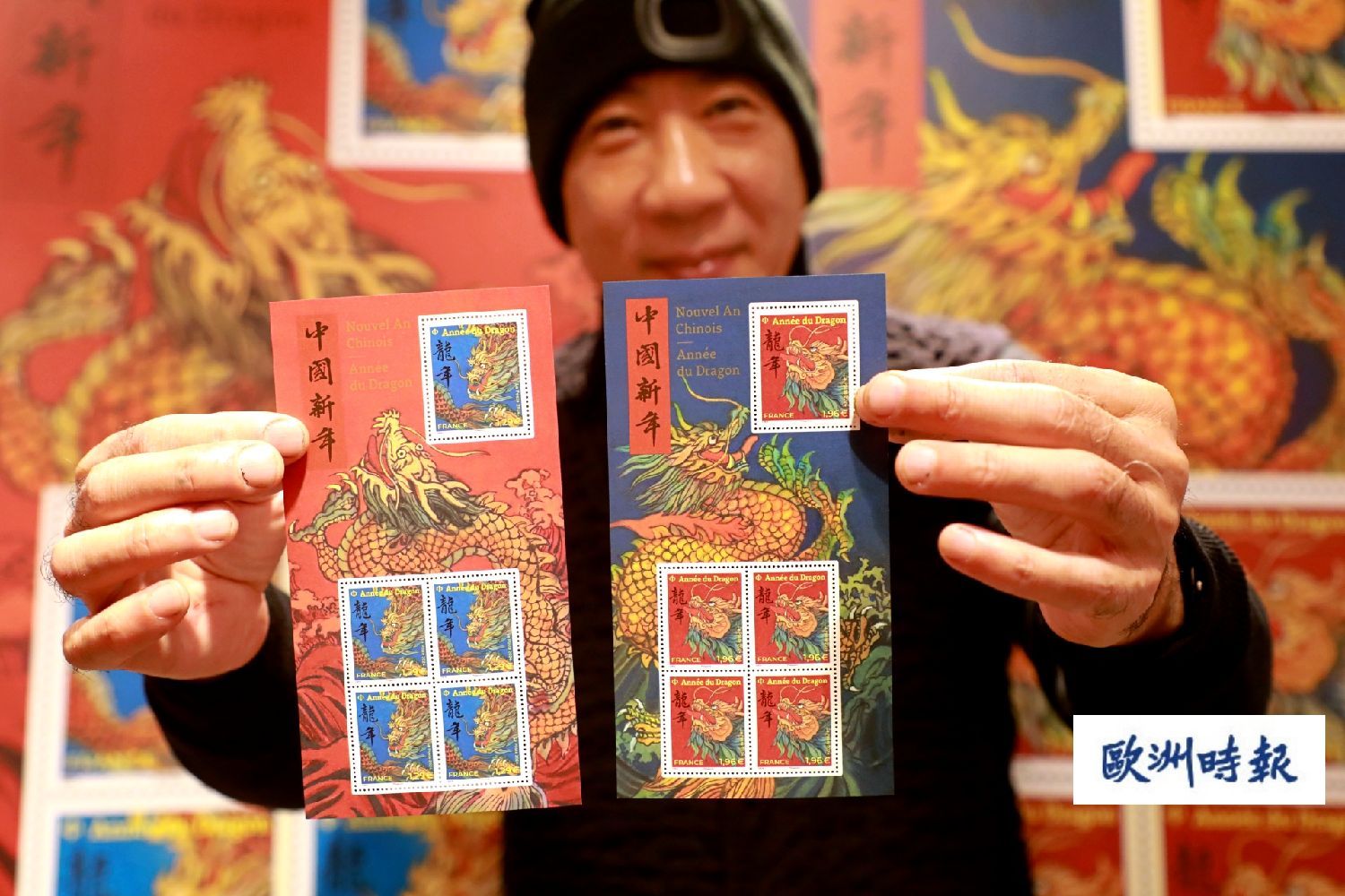 陈江洪告诉欧洲时报记者,今年的甲辰龙年邮票,是自己设计的第六套法国生肖邮票。运用了大量中国画颜料红色,突出吉祥的象征意味,并且融合了工笔重彩的手法和写意的笔法,分别绘制了一条翱翔天际的飞龙和一颗傲然翘首的龙头。陈江洪表示,龙在中国人心中意义非凡,所以在设计一款纪念邮品时,他还尝试用一种景泰蓝的蓝色,更加彰显中国传统文化韵味和民族工艺的精髓。