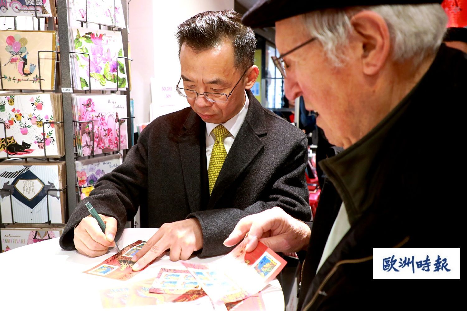当天上午9点不到,许多法国集邮爱好者已经冒雨等候在法国邮政集邮墨方厅门外,其中还有不少在法的华侨华人集邮爱好者。一名华人女子还拿出好几张2000年加拿大发行的千禧龙年纪念封,贴上今年法国甲辰龙年邮票让设计时陈江洪签名留念,还要求陈江洪盖上印章。