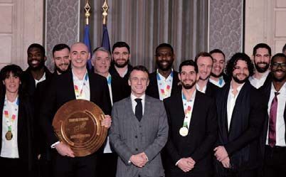 图为法国总统马克龙29日在爱丽舍宫接见男子手球队表达祝贺。法新社图
