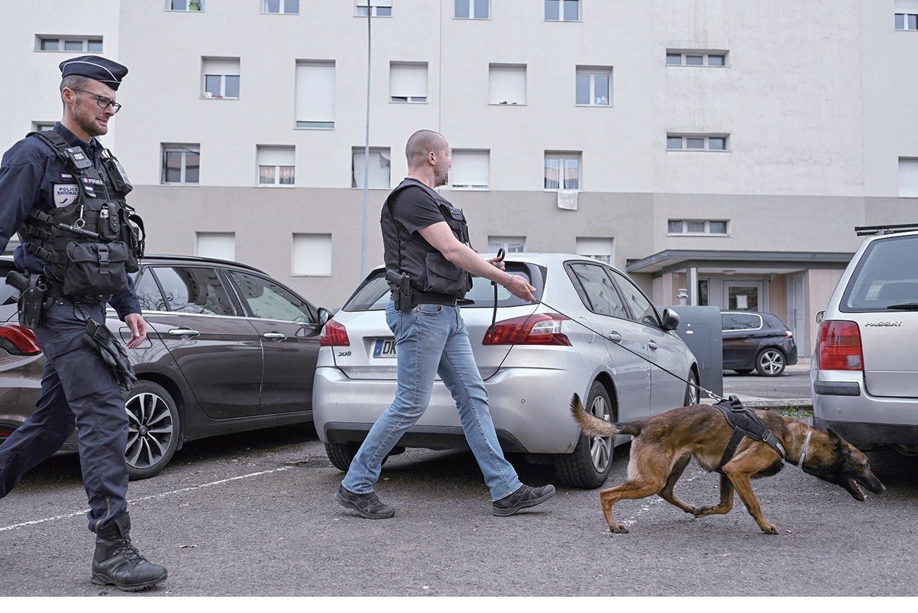 图为3月25日,法国警察携缉毒犬在第戎附近小城尚奥夫(Chenove)一处社会住宅楼群参与行动。法新社图