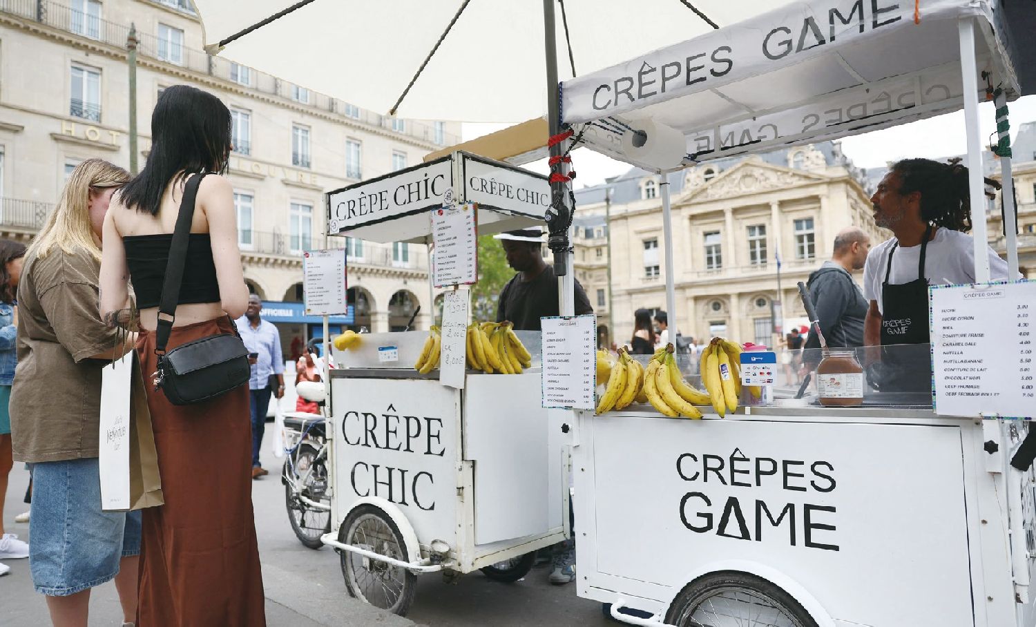 7月11日,游客在巴黎街头选购小吃。当日,法国财长勒梅尔宣布宣布,法国2024年必须节支250亿欧元以恢复公共财政平衡,并于当天函告政府各部50亿欧元的减支目标。欧盟日前警告,法国赤字飙升形势如不能扭转,将面临融资困难并导致经济、金融崩溃。法新社图