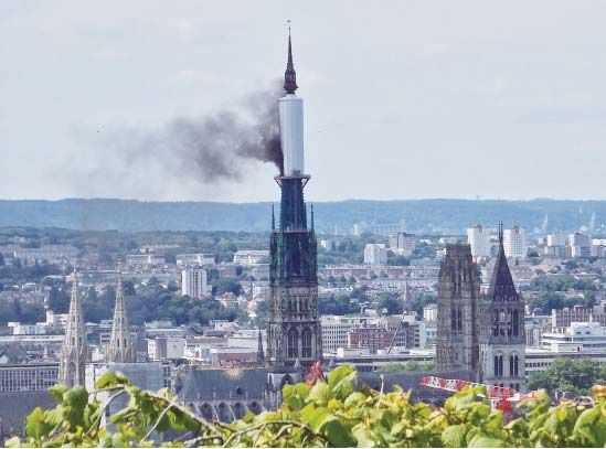 鲁昂大教堂因印象派画家莫奈多次作画而广为人知。图为11日起火冒烟的鲁昂大教堂尖塔。法新社图